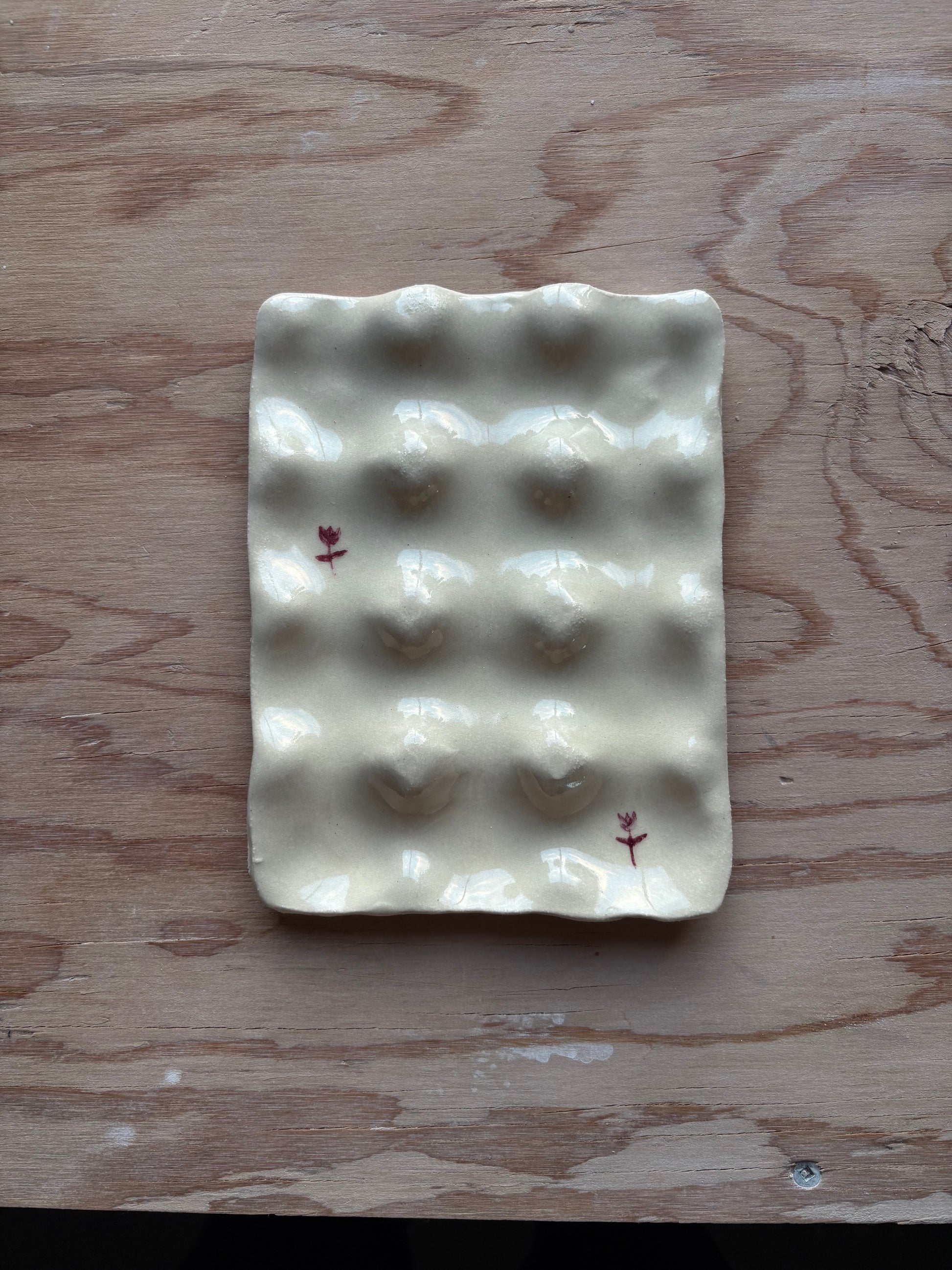Hand built and glazed on a white clay.